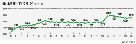 4월 30일 한국거래소에 따르면 초록뱀미디어 주가는 올 4월 이후 같은 달 29일까지 45% 수직 상승했다.