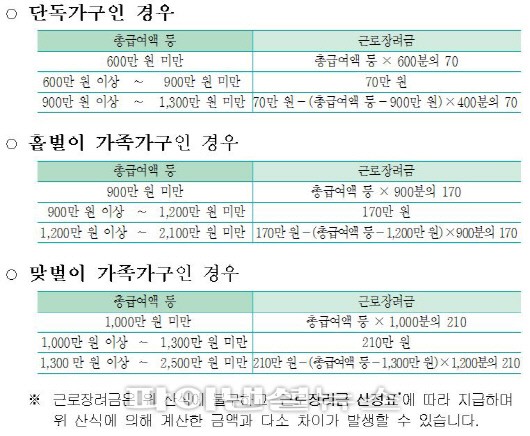 국세청이 지급하는 근로장려금(EITC)은 최대액(연간)이 단독가구(총소득 기준금액 1300만원 미만)의 경우 70만원, 홑벌이 가구(〃 2100만원 미만) 170만원, 맞벌이 가구(〃 2500만원 미만) 210만원이다.