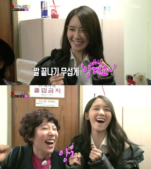 지난 3일 방송된 KBS 2TV '인간의 조건'에서 소녀시대 윤아는 자신을 찾아온 김영희를 바라보며 “앙대오”라고 외쳤다.