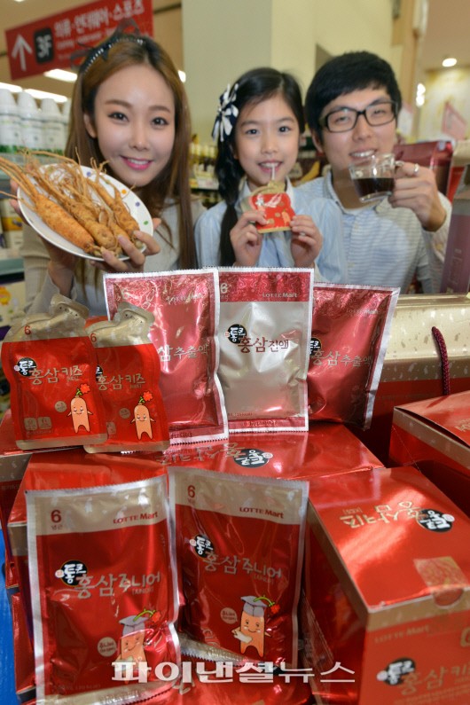 롯데마트가 6일 오전 서울 한강대로 서울역점에서 온 가족이 즐길 수 있는 '통큰 홍삼 파우치' 4종을 시중 가격 대비 절반 수준에 선보이고 있다. 이번에 선보이는 '통큰 홍삼 파우치' 4종은 성인용, 청소년용, 어린이용으로 만들었으며 '통큰 홍삼 추출액'은 72,000원, '통큰 홍삼 진액'은 43,000원 이다./사진=서동일기자