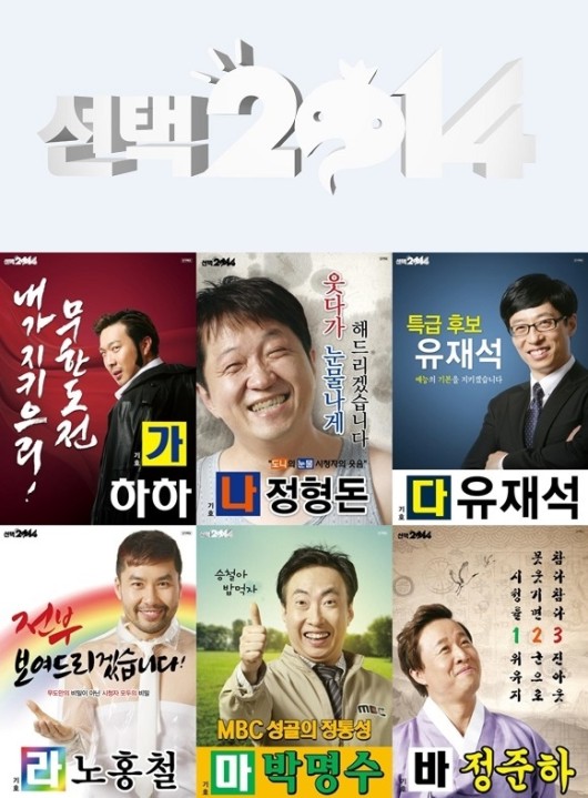 오는 10일 방송되는 MBC 예능프로그램 ‘무한도전’에서는 ‘선택 2014’에 출마한 여섯 멤버(하하, 정형돈, 유재석, 노홍철, 박명수, 정준하)의 선거 홍보 영상이 공개된다.