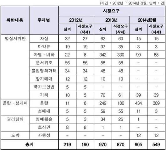 또 문서위조, 성매매, 불법명의거래, 마약류 등 범죄 관련 게시물도 상당수가 올라와 방심위의 시정 요구를 받았다.