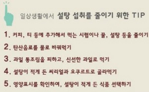 과일이나 우유 등의 건강식품에서도 자연적으로 발생하는 설탕 이외 다양한 간식으로 추가 섭취되는 가공식품 섭취량(46.1g)이 높기 때문이다. 그 중에는 음료수류가 14.3g(30.4%)로 가장 높았다. 이어 빵 및 과자, 아이스크림이었다.