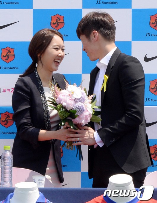 김민지 아나운서의 꽃다발을 받은 박지성은 환한 미소로 답했고, 두 사람은 함박 웃음을 지었다. 이후 김민지는 별다른 언급 없이 기자회견장을 빠져나갔다.