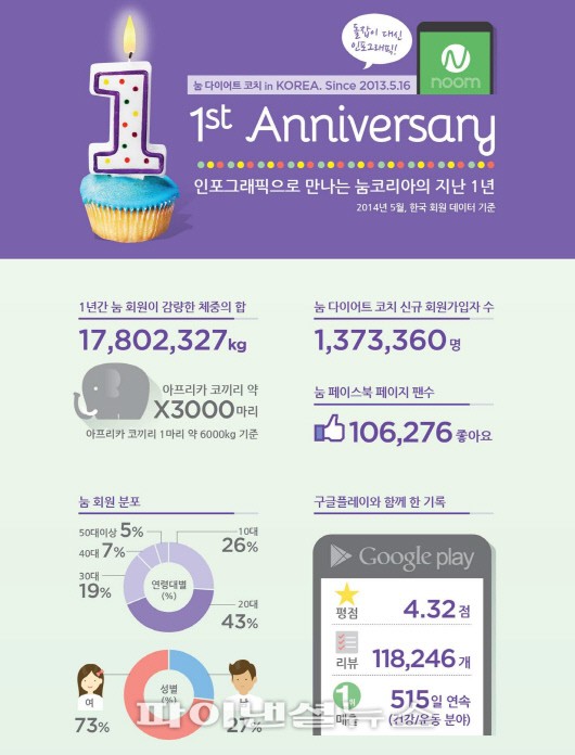 다이어트 응용프로그램(애플리케이션·앱) '눔 다이어트 코치'를 개발한 눔(Noom)의 한국 지사인 눔코리아는 설립 1주년을 기념해 1년간의 역사를 한 눈에 볼 수 있는 인포그래픽을 16일 공개했다.
