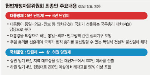 자문위가 내놓은 최종 개헌안의 핵심 내용인 '6년 단임제'는 4년 중임제와 5년 단임제의 절충안이다.