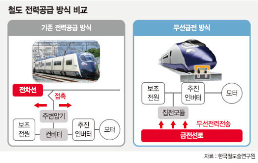 한국철도기술연구원은 머리 위 전차선이 아닌 열차 바닥에 전기를 공급해 고속열차를 움직이는 1㎿(1000㎾)의 대용량 전력을 무선 고주파(60㎑)로 전송하는 기술을 세계 최초로 고속열차에 적용하는 시험을 이날 철도연 무선급전시험선에서 공개했다.