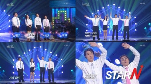 지난 1일 오후 방송된 KBS 2TV 예능프로그램 ‘개그콘서트’ 코너 ‘렛잇비’에서는 송필근, 박은영, 이동윤, 노우진 등이 출연해 직장인들의 애환을 노래로 풀어냈다.