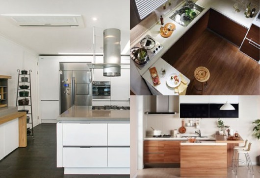 개수대와 가열대를 직각으로 배치한 후 나머지 한 면에 아일랜드 카운터를 배치해 ㄷ자 형 주방을 연출하는 것도 좋은 방법이다. 창가쪽 벽면에 싱크대를 설치하고, 주방 가운데 바(bar) 형태의 아일랜드 카운터를 배치하면 공간을 넓게 활용할 수 있으면서도 조리 및 설거지를 할 때의 동선을 줄일 수 있다. 또한 카운터 영역은 가족들이 함께 음식 준비를 하거나 휴식을 취하기 좋아 주방공간의 활용도를 높여준다.