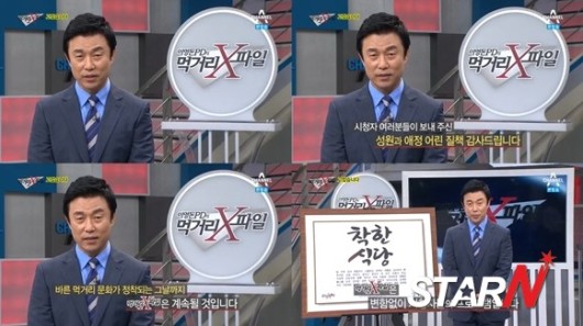 이어 “여러분이 보내주신 성원과 애정 어린 질책 감사드린다”며 “우리 사회에 불량 먹거리, 착한 식당이 있는 한 ‘먹거리 X파일’은 계속될 것”이라고 덧붙였다.