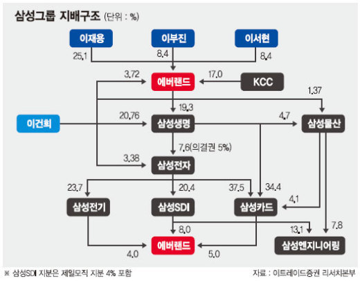 이 때문에 증권가는 에버랜드가 삼성그룹 경영 승계의 키를 쥐고 있는 회사로 꼽고 있다. 실제 이건희 삼성전자 회장(3.72%)을 포함 현재 삼성가가 보유한 삼성에버랜드 지분은 총 46%에 달한다. 최대주주는 25.1%를 보유한 장남 이재용 부회장이다.
