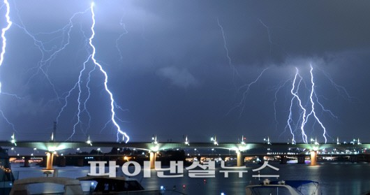 전국 곳곳에 천둥,번개를 동반한 소나기가 내리고 있는 10일 밤 서울 여의도 한강시민공원에서 바라 본 서울하늘에 번개가 치고 있다. 2014.6.10/김범석기자