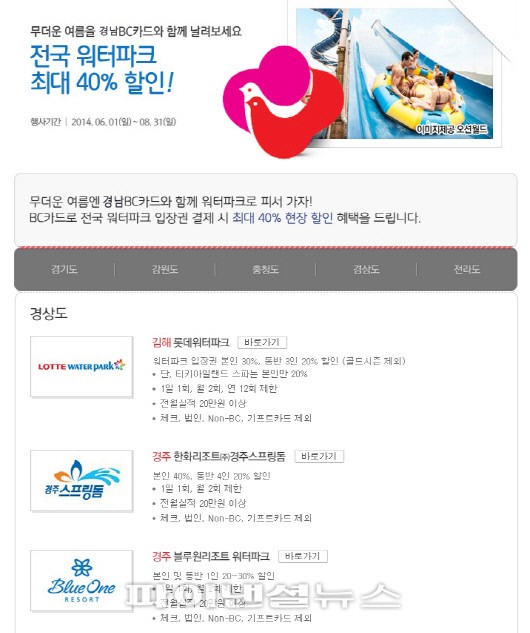 경남은행(은행장 손교덕)은 본격적인 여름을 맞아 오는 8월 31일까지 '경남BC카드 전국 워터파크 입장권 할인행사'를 한다고 17일 밝혔다.