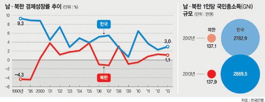 한국은행이 27일 내놓은 '2013년 북한 경제성장률 추정 결과'에 따르면 지난해 북한의 국민총소득(명목GNI)은 33조8000억원으로 추정됐다. 이는 한국 국민총소득의 42.6분의 1 수준으로, 2011년(41.6분의 1)과 비교해 남북한의 소득수준 격차는 심화됐다.