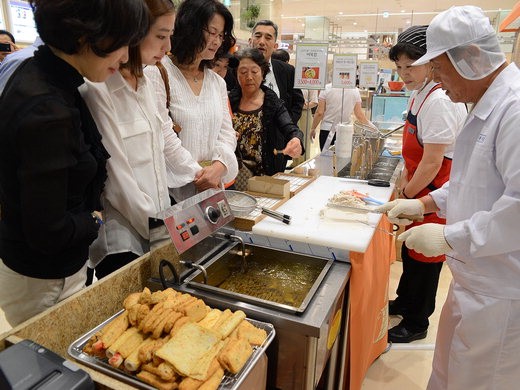 부산 중앙동 롯데백화점 광복점은 지하 1층 식품관에서 부산 원조 초량 어묵이 '부산진심어묵' 브랜드 론칭을 기념, 오는 7월 3일까지 초량어묵 장인인 박경수 대표가 반죽에서 튀김까지 어묵 제조 전 과정의 시연행사를 진행한다고 29일 밝혔다. 50년 전통의 부산 초량 어묵은 70% 이상의 어육을 사용하는 전통 수제 어묵으로 큰 인기를 얻고 있다. 고객들이 박 대표의 어묵 제조 시연을 관람하고 있다.