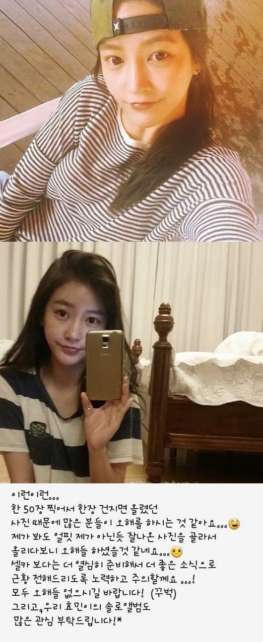 이어 “셀카 보다는 더 열심히 준비해서 더 좋은 소식으로 근황 전해드리도록 노력하고 주의할게요. 모두 오해들 없으시길 바랍니다”라며 성형 의혹을 일축했다. 그러면서 “우리 효민이의 솔로 앨범도 많은 관심 부탁드립니다”라고 최근 솔로로 나선 멤버 효민을 응원했다.