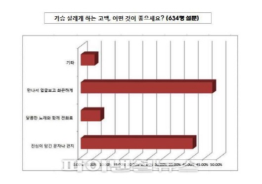 또한 '가슴 설레게 하는 고백, 어떤 것이 좋으세요?'라는 질문에 대해 634명이 응답했는데, "만나서 얼굴보고 화끈하게"가 301명(47.5%), "진심이 담긴 문자나 편지"가 256명(40.4%), "달콤한 노래와 함께 전화로"가 45명(7.1%), '기타'가 32명(5%) 순이었다.