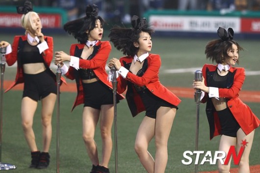 ‘2014 한국야쿠르트 세븐 프로야구’ 넥센 히어로즈와 NC 다이노스의 경기가 11일 오후 목동구장에서 열린 가운데 걸그룹 단발머리가 5회말 종료 후 공연을 하고 있다.