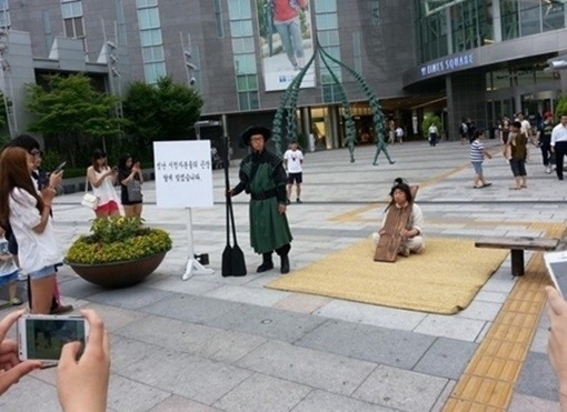 게재된 사진에서 박명수는 영등포 타임스퀘어 광장에서 흰 소복을 입고 목에 칼을 찬 채 시민들의 곤장을 기다리고 있는 모습이 담겨 있어 눈길을 끈다.