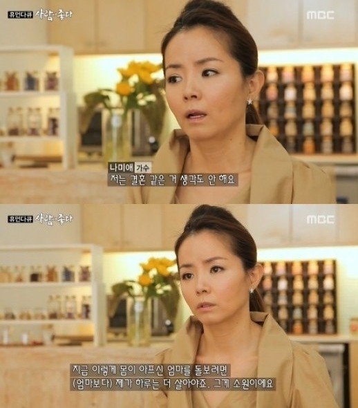 이날 나미애는 제작진과의 인터뷰에서 “나는 결혼이라는 것을 생각해 보지도 않았다”며 “내가 아니면 아픈 어머니를 챙길 수 있는 사람이 없다고 생각 한다”라고 말문을 열었다.
