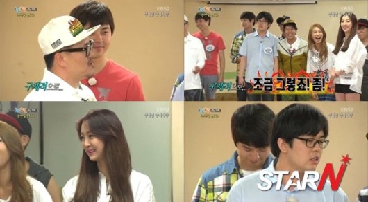 이날 방송에서 선생님들과 ‘1박2일’ 멤버들은 저녁식사를 마친 후 강당에 모였고, 걸그룹 씨스타가 야식을 들고 등장해 모두 놀라워했다.