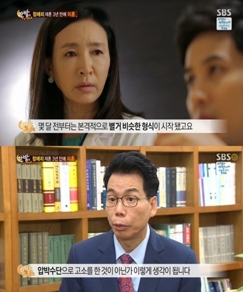 또한 정애리 측 법률대리인은 "정애리와 지승룡 대표는 가치관이 달랐고, 신념 극복 하지 못한 것으로 알려졌다. 이혼은 마무리 됐는데 새로운 변수가 생겼다"라고 말했다.