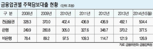 25일 금융위원회와 금융감독원에 따르면 올해 5월 말 기준 금융권 전체의 주택담보대출 금액은 504조4000억원에 달한다. 은행 주담대가 가장 많은 377조5000억원이었다.