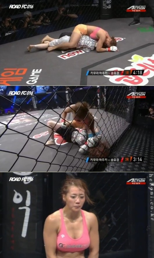 송효경은 26일 경북 구미 박정희체육관에서 열린 ‘로드FC 016’ 여성부 2경기(-54㎏ 계약체중)에서 기무라 하즈키를 제압하고 승자가 됐다.