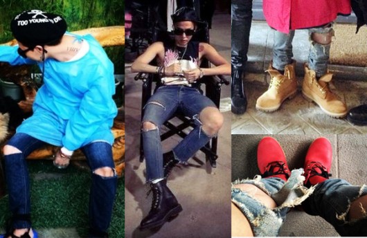 '디스트로이드 진', '데미지 진' 등으로 불리는 찢어진 청바지는 지드래곤이 즐겨 착용하는 패션 아이템이다.