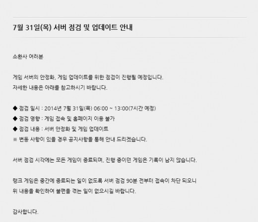이번 롤점검은 서버 안정화 및 게임 업데이트를 위한 것으로, 이날 오전 6시부터 오후 1시까지 약 7시간 동안 롤점검이 진행된다. 롤점검 시각에는 모든 게임이 종료되며 진행 중이던 게임은 기록이 남지 않는다.
