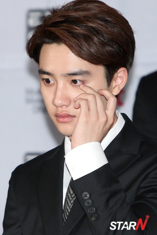 그룹 엑소 디오가 11일 오전 서울 마포구 상암동 CJ E&M센터 미디어홀에서 열린 Mnet 'K-POP 타임슬립' EXO 902014 기자간담회에 참석해 눈을 만지고 있다.