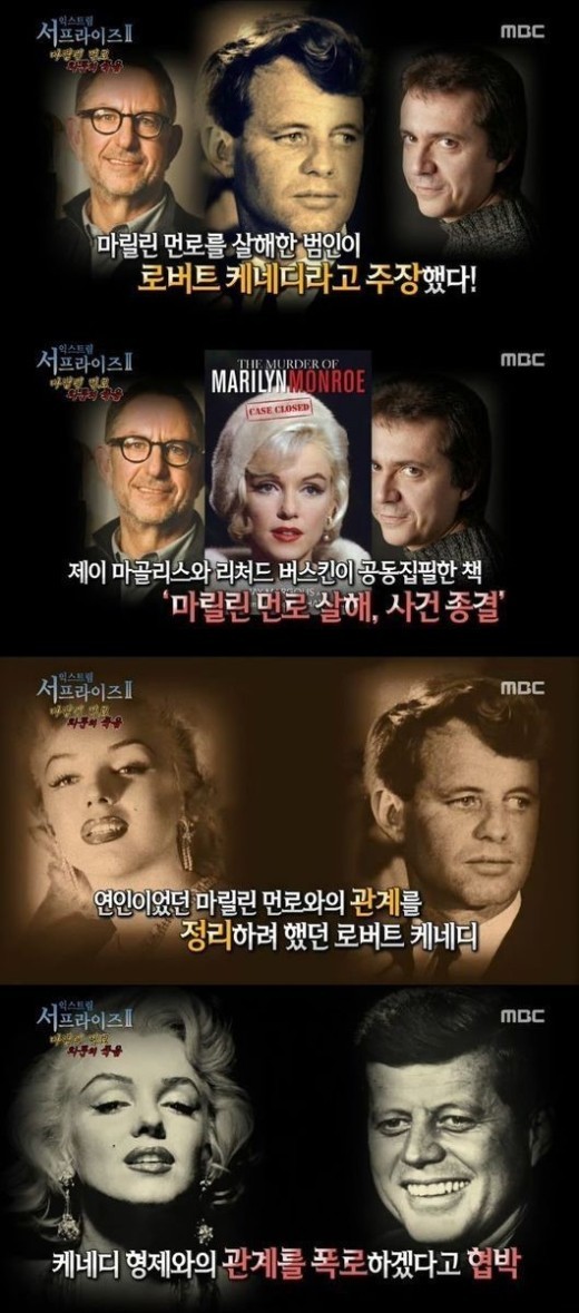17일 방송된 MBC '신비한TV 서프라이즈'에서는 할리우드 케네디 대통령의 동생 로버트 케네디가 마릴린 먼로를 살해했다고 주장하는 '마릴린 먼로 살해사건 종결'의 두 작가 제이 마골리스와 리처드 버스킨의 이야기가 그려졌다.