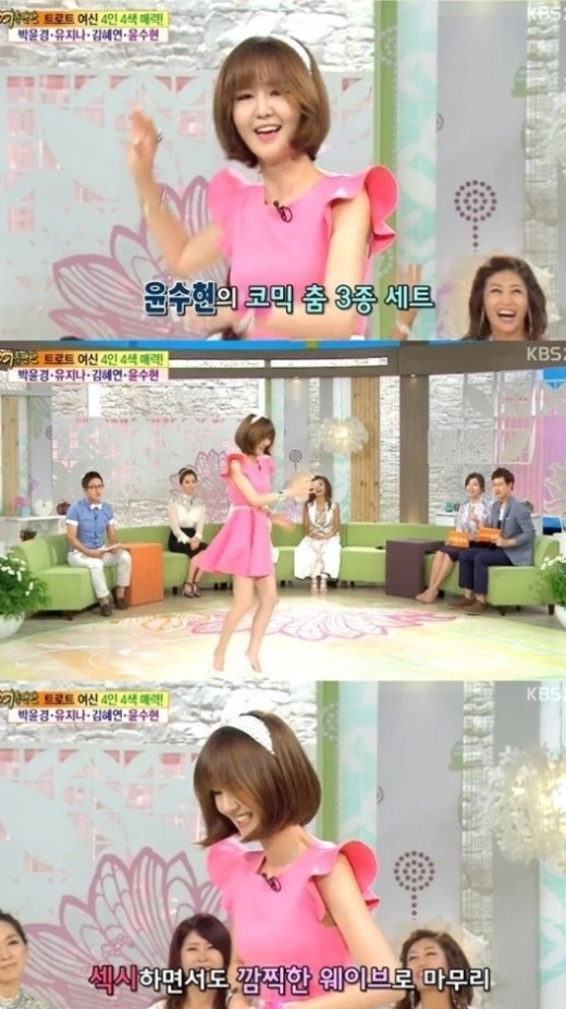 윤수현은 21일 오전 방송한 KBS2 예능프로그램 '여유만만'에서 코믹춤 3종 세트를 선사했다.