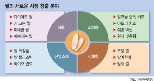 쌀은 또 의약용으로도 활용된다. 쌀에 함유돼 있는 약리 성분을 강화하거나 생명공학기술을 활용해 질환의 치료 목적으로도 쓰이는 것이다. 또 일반쌀의 표면에 베타카로틴이나 키토산, 셀레늄을 코팅할 경우 쌀 이상의 효과를 내기도 한다. 이와 함께 현미에 있는 성분을 활용하면 보습, 항노화, 미백화장품뿐만 아니라 전분은 바이오 플라스틱 등 산업소재로도 활용할 수 있다. 쌀엔 밥뿐만 아니라 플러스 알파(α)가 있는 셈이다.