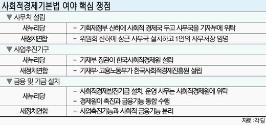 여야가 연내 제정안 통과를 목표로 세웠지만 △사회적경제 컨트롤센터 산하 사무처 위상 △사업추진기구 운영방식 △기금운용 형태 등 3대 과제를 놓고 이견이 커 법안 병합심사 과정에 진통이 예상된다.