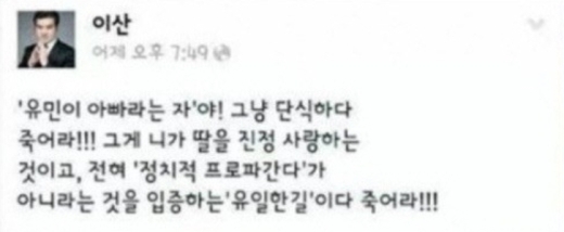 뮤지컬 배우 이산이 트위터에 "유민이 아빠라는 자야, 그냥 단식하다 죽어라. 그게 네가 딸을 진정 사랑하는 것이고, 전혀 '정치적 프로파간다'가 아니라는 것을 입증하는 유일한 길이다.