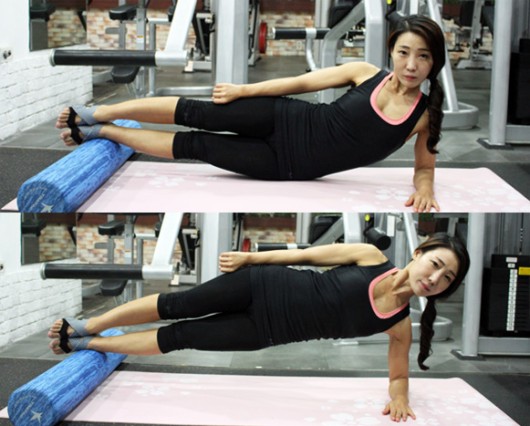 1. 옆으로 비스듬히 누운 자세를 취한 뒤, 두 다리를 모아 폼롤러 위에 올린다. 이 때 바닥에 닿은 팔은 팔꿈치를 굽혀 바닥과 수직이 되게 하고, 다른 쪽 팔은 엉치뼈 쪽으로 곧게 뻗어준다.