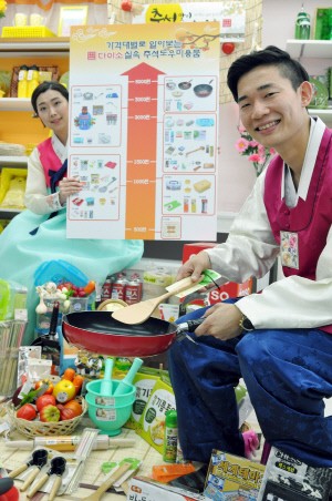 조리 및 주방용품의 경우 채칼, 감자칼에서부터 기름종이, 키친타올, 뒤지개 등 주방에 필요한 대부분의 상품이 준비된다. 프라이팬, 냄비, 채반, 소쿠리 등은 5000원 이하에, 밤가위 및 호두까기 등은 각각 2000원과 3000원이다.