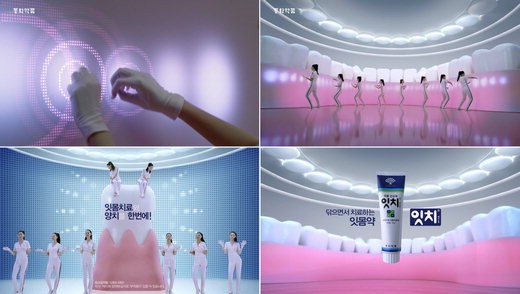 광고에는 잇치를 상징하는 순백색(치약 성분)에 커피색 줄무늬(잇몸약 성분)가 들어간 의상을 입은 '잇치걸'들이 등장합니다.