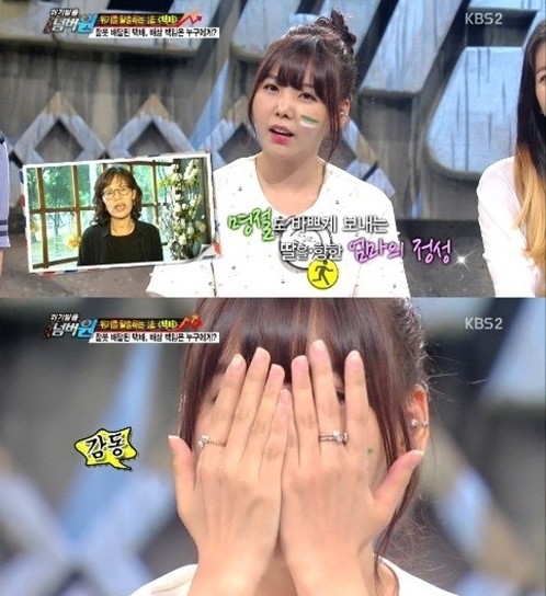 레이나가 ‘위기탈출 넘버원’에서 엄마의 언양불고기 선물과 영상편지에 눈물을 흘렸다.