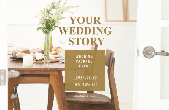 매터앤매터 '웨딩 패키지'는 혼수 필수 가구인 테이블과 의자로 구성됐으며, 판매가 대비 최대 15% 할인 판매한다. 4인용 테이블, 티 테이블, 암체어, 소파 등 제품 구성에 따라 총 4가지의 패키지로 선보였다. 소비자의 취향에 따라 제품을 조합해 구매할 수 있어 선택의 폭을 넓혔다.