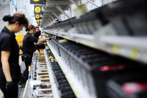 23일 찾은 경기 보정동의 이마트몰 온라인 전용 물류창고 2층. 직원들이 모니터를 통해 수량과 제품을 확인한 뒤 컨베이어 벨트를 따라 이동하는 바구니에 제품을 넣고 버튼을 누르자 또 다른 바구니가 준비됐다. 자동화시스템으로 부족한 재고는 실시간으로 채워진다.