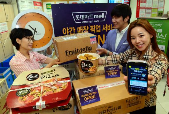 롯데마트는 24일 서울 롯데마트 서울역점에서 모델들이 야간픽업서비스를 소개하고 있다.