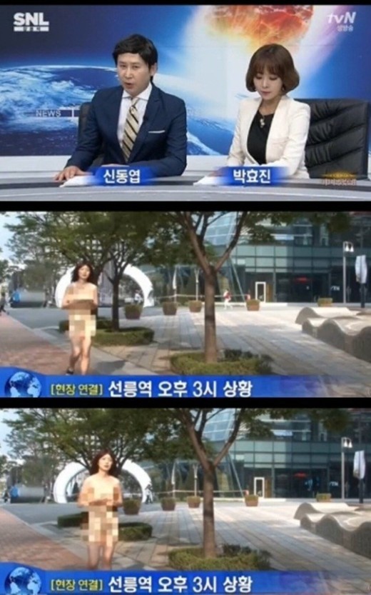 안영미 SNL 안영미가 SNL 코리아에서 '선릉역 알몸녀'를 패러디해 화제가 되고 있다. 지난 27일 방송된 tvN 'SNL 코리아'에 출연한 안영미가 지구 종말을 앞두고 취재를 나간 리포터로 변신했다. 이날 아나운서를 맡은 신동엽은 "정체를 알 수 없는운석이 지구와 충돌할 예정이다"며 지구 종말을 알렸다. 이어 그는 "종말을 앞둔 시민들을 만나기 위해 선릉역 현장에 나가 있는 안영미 리포터를 불러보겠다"며 안영미와 생중계 연결을 시도했다. 하지만 안영미는 취재를 잊은 채 살색 의상만을 입고 거리를 질주했고, 여기에 모자이크가 더해져 안영미가 마치 알몸처럼 보이는 착시효과가 발생했다.