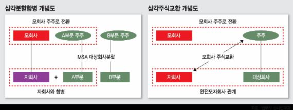 앞서 2012년 상법이 개정되면서 자회사가 모회사 주식을 넘겨 합병하는 순삼각합병이 허용됐지만 M&A 시장에서 수요가 있던 역삼각합병에 대한 법적 근거는 없었다. 법무부 관계자는 "삼각분할합병과 삼각주식교환을 통해 모회사의 주주총회를 생략할 수 있어 절차가 간소화되고 합병 대가로 모회사의 주식을 줄 수 있어 합병 대가가 유연해진다"고 설명했다.