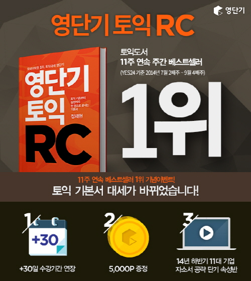 한편, ‘영단기 토익RC’는 기존 토익교재들 사이에서 무서운 돌풍을 일으키며 빠른 속도로 1위 자리에 오른 영단기의 첫 번째 토익 기본서다. 55만 취업준비생이 선정한 BEST 토익강사 1위 영단기 어학원의 정재현 강사가 직접 집필한 최신 교재로, 2014년 최신 토익시험의 출제 경향까지 완벽 반영해, 변화하는 토익 유형에 최적화 되어 토익 기본부터 고득점을 목표로 하는 학생들에게 필독서로 꼽히고 있다.