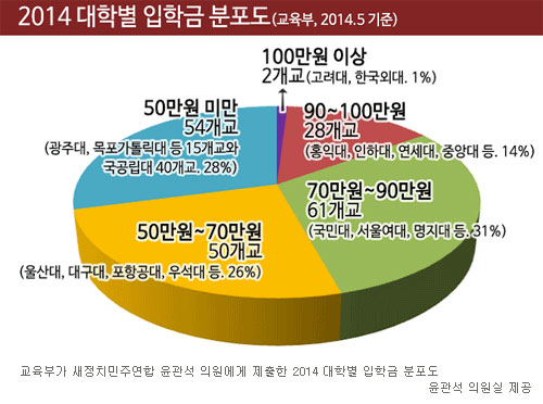 입 학금이 100만 원 이상인 학교는 고려대, 한국외대 등 2개교(1%)였고, 90만원 이상~100만 원 미만은 홍익대, 연세대 등 28개교(14%)였습니다. 또 70만 원 이상~ 90만 원 미만인 대학은 국민대, 명지대 등 61개교(31%), 50만원 이상 ~ 70만 원 미만은 울산대, 포항공대 등 50개교(26%), 50만 원 미만 대학(입학금이 없는 2개 대학 포함) 은 40개 국공립대학과 14개 사립대 등 모두 54개교(28%)였다.