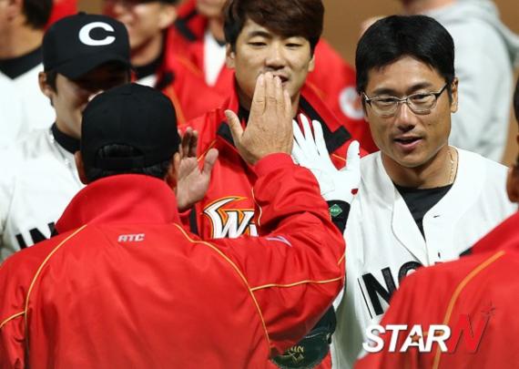 ‘2014 한국야쿠르트 세븐 프로야구’ SK 와이번스와 NC 다이노스의 경기가 7일 오후 인천 문학구장에서 열린 가운데 SK 선수들이 승리에 기뻐하고 있다.