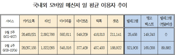 반면 러시아 개발자가 독일에 서버를 두고 서비스하는 텔레그램의 이용자는 일평균 이용자수는 52만여명으로 1주일 전보다 20배 이상 늘었다. 더구나 한글 서비스도 새로 출시돼서 이용자는 더 증가할 것으로 보인다.