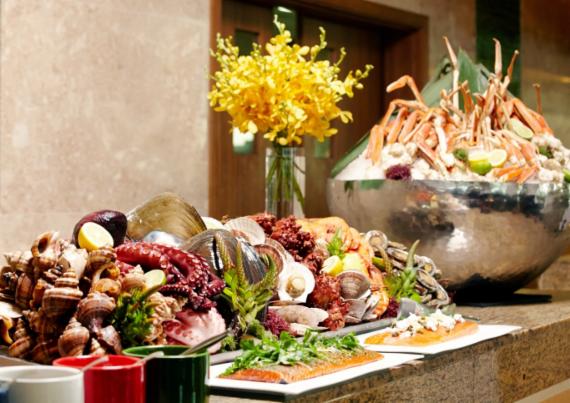 해산물 요리 외에도 한식 메뉴와 라이브 스테이션에서 선보이는 그릴 요리, 회, 초밥을 맛볼 수 있으며, 과일이나 케이크, 푸딩, 아이스크림 등의 디저트도 마련돼 있다.